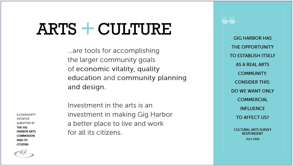 The Gig Harbor Arts Commission successfully completed in creating and promoting a Cultural Element for future engagement and growth for the arts in the community. Robin was also part of the original cultural planning process for the City of Bellevue as a member of the Bellevue Arts Commission and lead for the planning project. She is currently the Vice Chair of the Gig Harbor Arts Commission, as well as on the Executive Board of the Washington State Arts Commission.